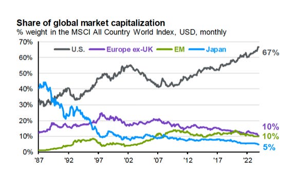 U.S. stocks now represent the largest share of global market capitalization since the late 1980s.