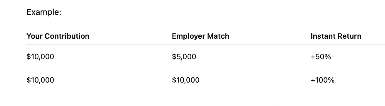 If your employer offers matching → contribute at least enough to capture 100% of the match.