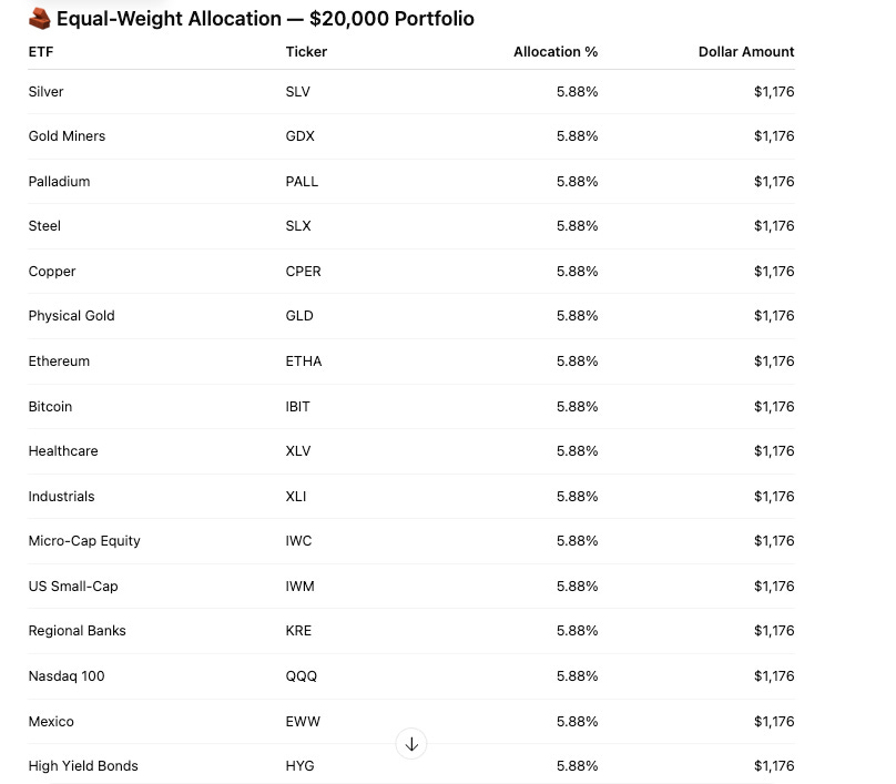🧱 Equal-Weight Allocation — $50,000 PortfolioETFTickerAllocation %Dollar AmountAll 17 ETFs—5.88% each~$2,941 per ETF