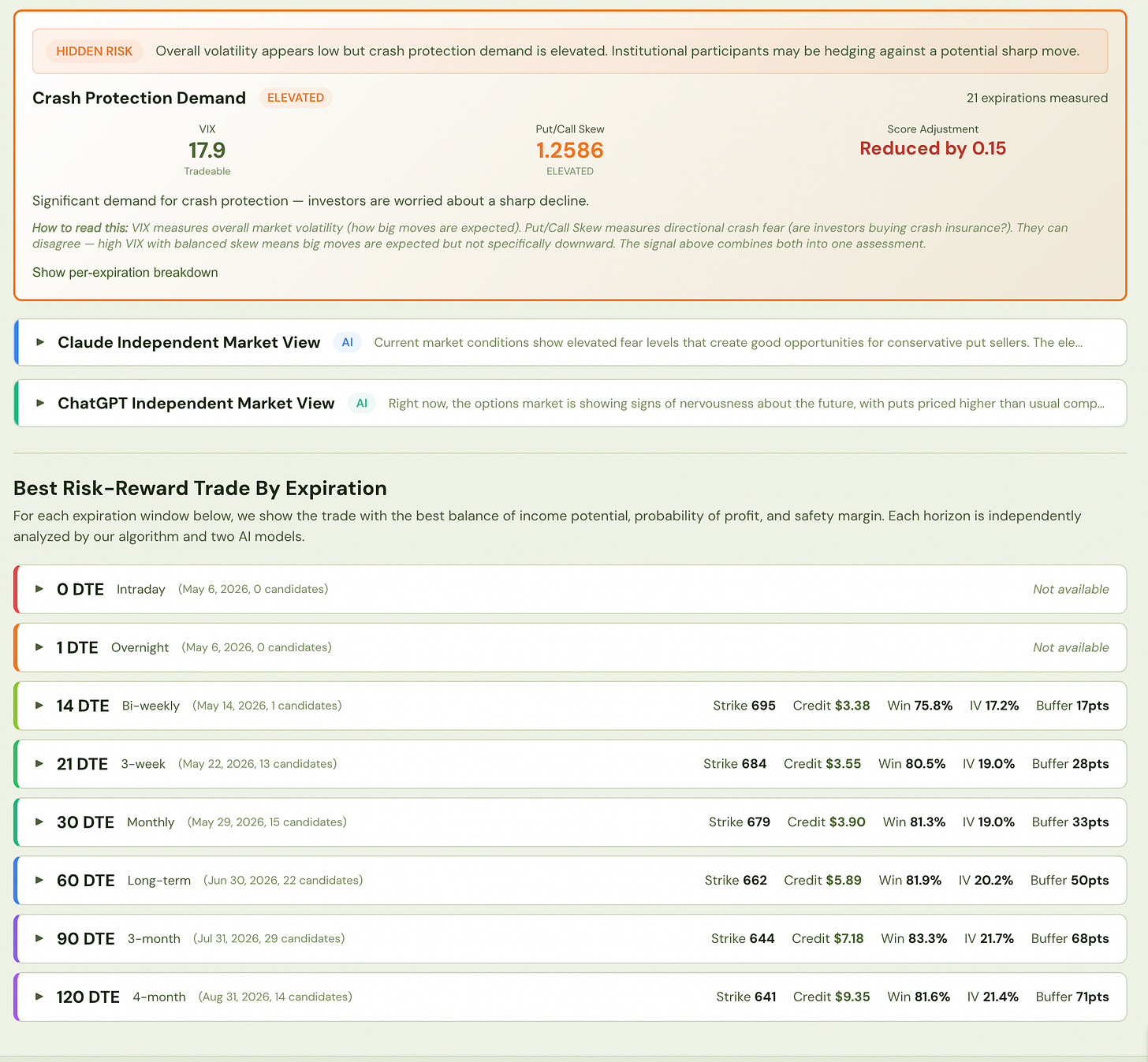 The Put Selector and any associated analytics are based on quantitative models, assumptions, and market data that may be incomplete, delayed, or subject to change without notice. These models cannot account for all market conditions, including extreme events, liquidity disruptions, or unforeseen risks (“tail risks”). Signals such as volatility, skew, or “hidden risk” are interpretations, not guarantees.