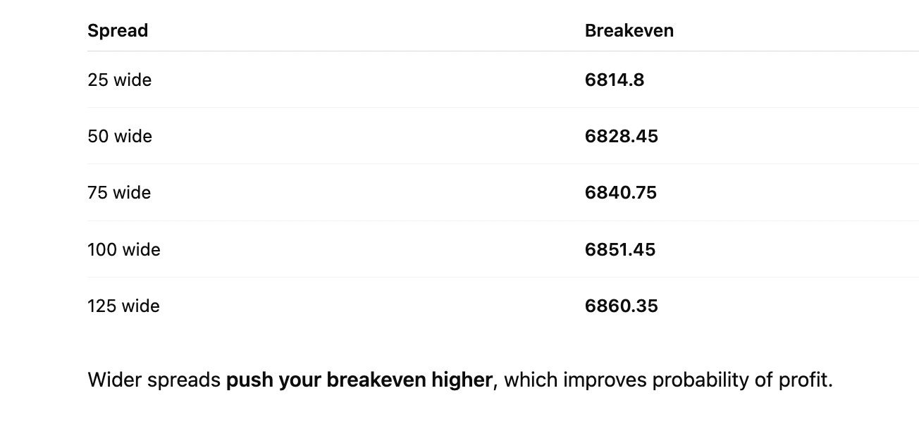 The examples above are meant to illustrate how different spread widths can change the risk-reward profile of a bearish SPX trade. A 25-point spread, a 75-point spread, or a 100-point spread may all express the same directional opinion, but they behave very differently in terms of capital at risk, breakeven levels, and probability of profit.