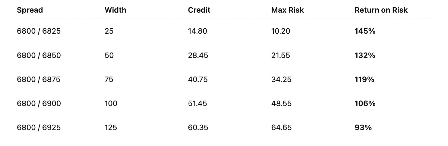 Let’s break this down like a derivatives desk would evaluate the trade: risk, return on risk, and payoff efficiency. This is the key when deciding which width vertical is actually the best trade, not just the one with the biggest credit.