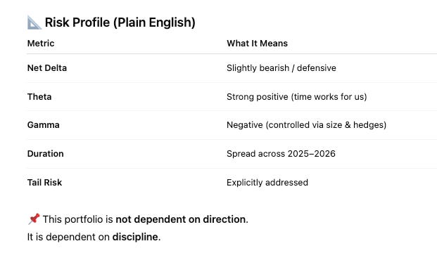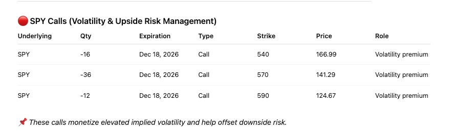 Transparency. Every position has a job: income, hedge, or tail protection.