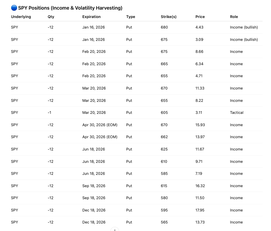 At its core, this is a structured options income portfolio built on SPY and SPX, combining: