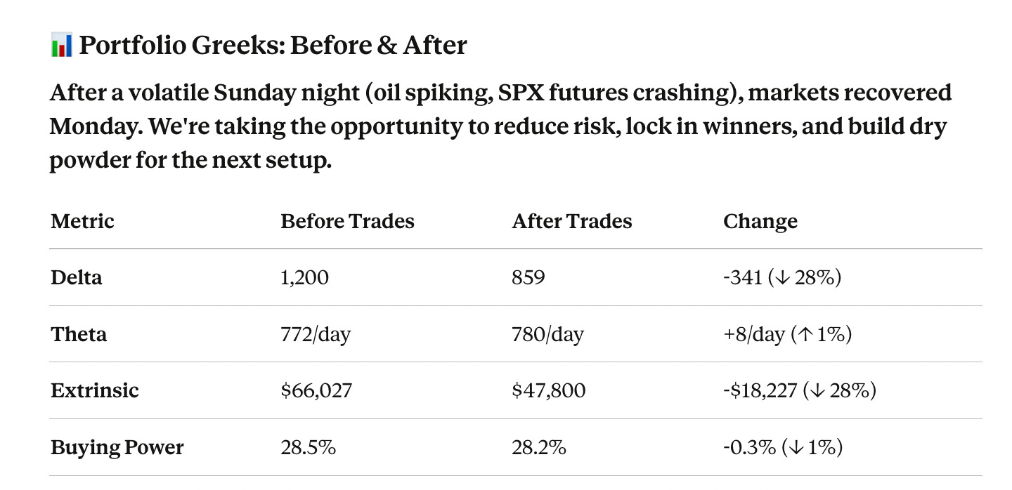 ✅ Delta reduced 28% (1,200 → 859): Significantly less directional risk. We were AT max (1,200 per $1M benchmark). Now 28% below max with room to add if needed.