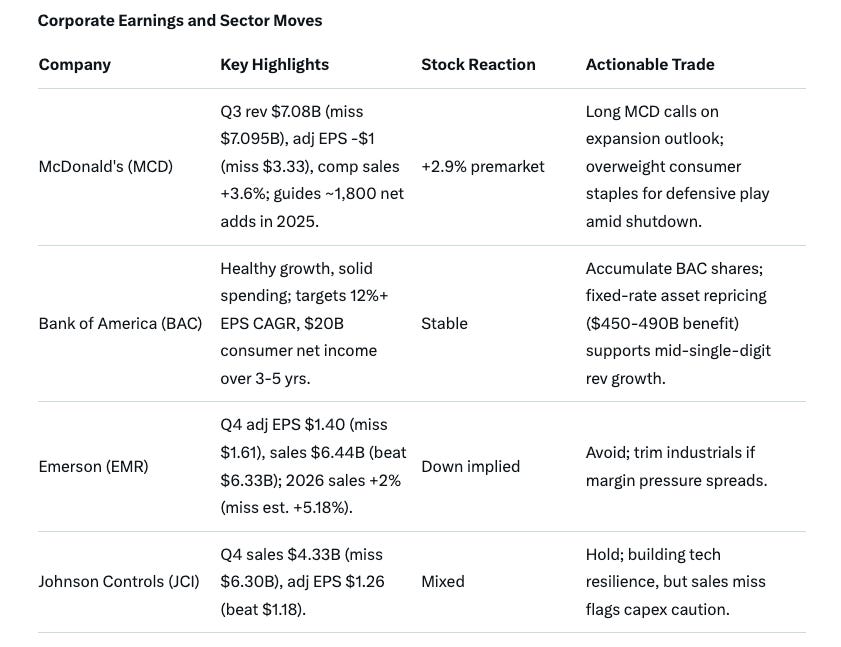Trading Action: Buy dips in rate-sensitive assets (e.g., long TLT ETF for bonds); monitor SOFR (now 4.00% from 4.13%) for repo stability—potential tailwind for banks (e.g., BAC targets 16-18% ROTCE). Volatility hedge via VIX calls if no deal by next week (airspace halts risk). Short-term bullish for USD as fiscal risks ease.